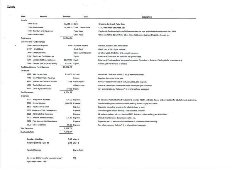 The Treasurer collects, keeps, disperses, and invests the funds of the Ozark LMSC and maintains all financial records. The treasurer presents a yearly budget to Ozark LMSC before the beginning of each fiscal year.